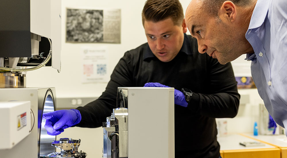 A sectioned lion tooth sample is loaded on the stage of a scanning electron microscope.